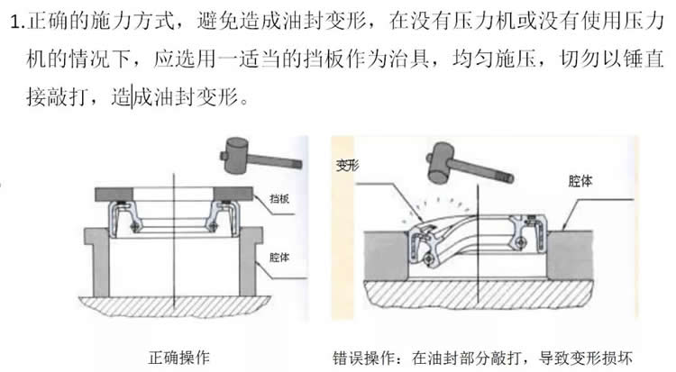 2.油封要平裝 ,不能有傾斜的現象。建議採(cǎi)用油壓設備(bèi)或套筒工具安裝。壓力不要太大,速度要均勻、要慢。