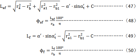 式中:C——由中心距偏差和配對齒輪的齒頂圓徑向跳動引起的齒根起始檢驗點展開長(zhǎng)度的變(biàn)化量,mm。