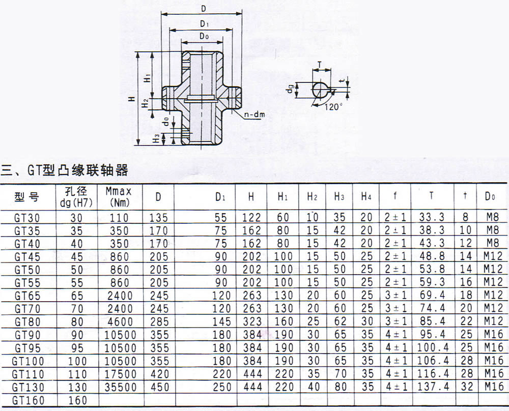 GT型凸緣聯軸器有如下型号:GT30,GT35,GT40,GT45,GT50,GT55,GT65,GT70,GT80,GT90,GT95,GT100,GT110,GT130,GT160