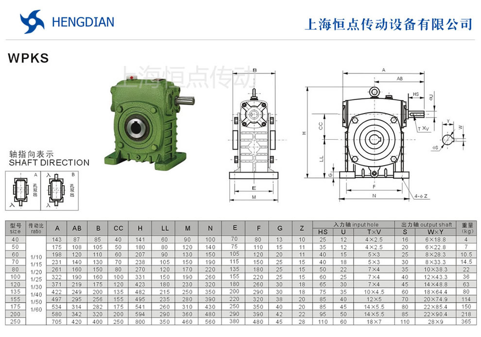 WPKS系列蝸輪蝸杆減速機的外形尺寸及安裝尺寸,WPKS系列蝸輪蝸杆減速機選型指南,選型方法,WPKS減速機軸輸入,孔輸出.WPKS減速機軸指向表示方法.機座号從40到250,可選減速比從10到60.