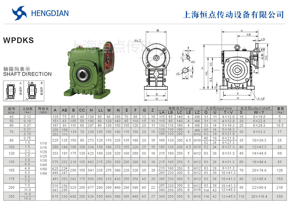 WPDKS蝸輪蝸杆減速機的外形尺寸及安裝尺寸,WPDKS減速機法蘭輸入,軸輸出.WPDKS減速機軸指向表示方法.機座号從40到250,可選速比從10到60.WPDKS系列蝸輪蝸杆減速機選型指南