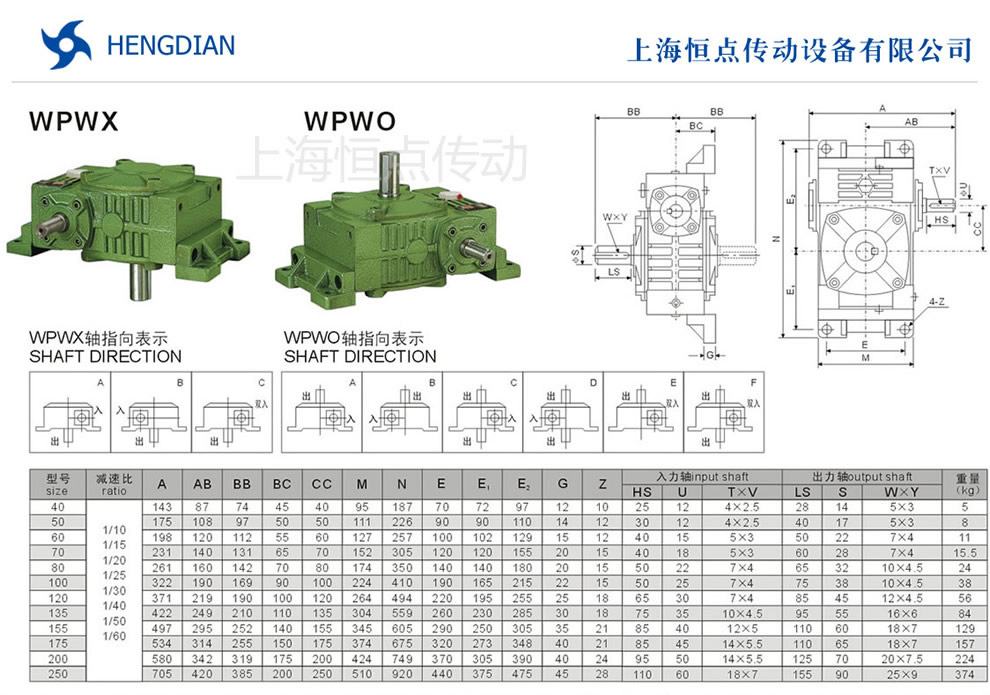 WPWX與WPWO系列萬能型蝸輪蝸杆減速機選型指南,WPWX與WPWO減速機軸輸入,軸輸出.機座号40到250,速比10到60.WPWX與WPWO萬能型減速機的外形尺寸及安裝尺寸